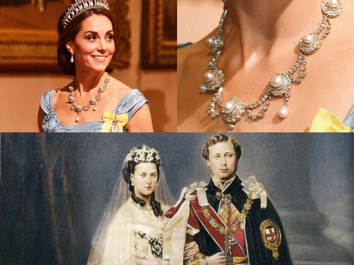 Шкатулка с драгоценностями английской королевы полна невероятно прекрасными украшениями. Сегодня дамы не так часто облачаются в роскошные платья, требующие такого количества драгоценностей, как раньше. Но иногда дамам из королевской семьи все же везет носить великолепные исторические украшения. Супруге принца Уильяма Кейт Миддлтон везет больше других, королева одалживает ей изделия, любимые в королевской семье и имеющие важное памятное значение. Одно из самых красивых и роскошных украшений, которое часто выбирает герцогиня Кембриджская – бриллиантовое ожерелье с подвесными жемчужинами – капельками. У этого ожерелья есть интересная история. В 1863 г. старший сын королевы Виктории Альберт (будущий Эдуард VII ) сочетался браком с датской принцессой Александрой. Статная и красивая Александра была старшей сестрой Марии Федоровны, супруги российского императора Александра III. Они даже внешне были похожи и обе обладали чувством вкуса и стиля, их нарядам подражала вся Европа. А сестрам нр
