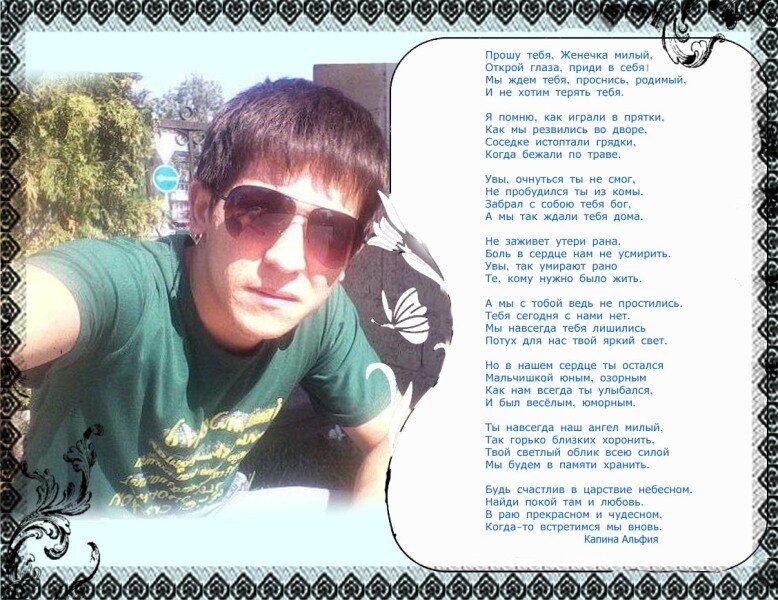 Прошу тебя, Женечка милый, Открой глаза, приди в себя! Мы ждëм тебя, проснись, родимый, И не хотим терять тебя. Я помню, как играли в прятки, Как мы резвились во дворе, Соседке истоптали грядки, Когда бежали по траве. Увы, очнуться ты не смог, Не пробудился ты из комы. Забрал с собою тебя бог, А мы так ждали тебя дома. Не заживет утери рана. Боль в сердце нам не усмирить. Увы, так умирают рано Те, кому нужно было жить. А мы с тобой ведь не простились. Тебя сегодня с нами нет. Мы навсегда тебя лишились Потух для нас твой яркий свет. Но в нашем сердце ты остался Мальчишкой юным, озорным Как нам всегда ты улыбался, И был весёлым, юморным. Ты навсегда наш ангел милый, Так горько близких хоронить, Твой светлый облик всею силой Мы будем в памяти хранить. Будь счастлив в царствие небесном. Найди покой там и любовь. В раю прекрасном и чудесном, Когда-то встретимся мы вновь. Капина Альфия *#*#*#*#*#*#*#*#*#*#*#*#*#*#*#* Стих посвящается племяннику, 19.04.2021г. © Copyright: Альфия Ка