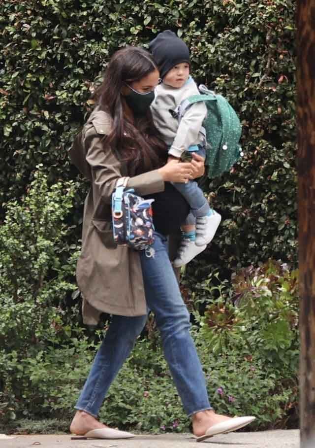 Беременная Меган несла сына одной рукой, а в другой руке несла его ланч-бокс.