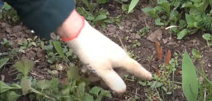 Его ещё не видно, вот выходят почки, то есть надо аккуратно выдернуть вокруг всю траву, определиться, где эти почки, главное не порубить. Аккуратно чуть порыхлить землю, у меня даже червяки есть, это значит всё хорошо, земля здесь хорошая, то есть я когда сажала, я добавляла перегной.