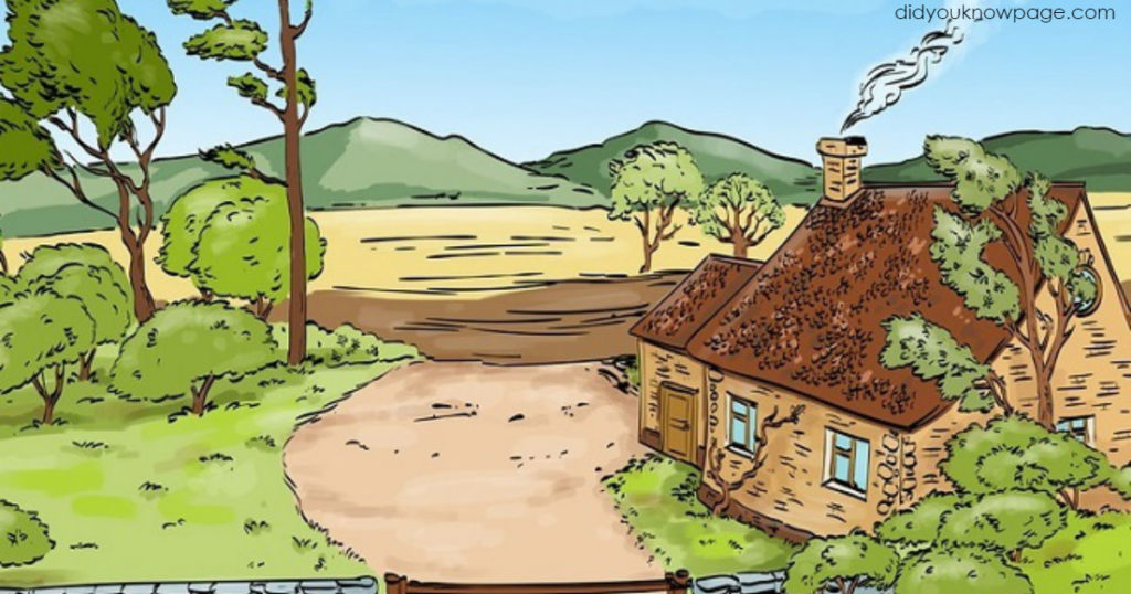 На этом рисунке изображен обычный деревенский пейзаж. Небольшой домик с оградой, деревья, и холмы вдалеке.