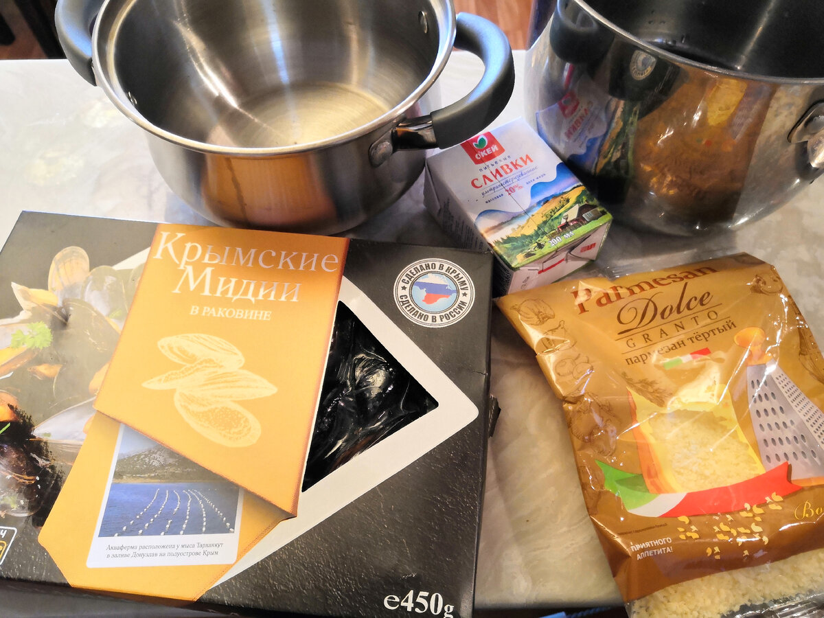 Всего 10 минут и деликатес, как из ресторана готов. Не верите? Давайте готовить вместе! Готовим мидии в сливочно-сырном соусе дома Все, что вам потребуется: Все просто, как готовить самих мидий- написано было на упаковке. Их нужно высыпать в кастрюлю, накрыть крышкой и не размораживая поставить на средний огонь на 5-7 минут. Готовые миди раскрывают створки, если ваши еще не раскрылись, можно немного увеличить время готовки. Одновременно готовим соус- в 200 мл сливок всыпаем з ложки с горкой тертого сыра и ставим на средний огонь. Варим помешивая до загустения, когда сыр расплавится и соус станет однородным. Не забывайте, что сыр должен быть хороший. Готовый через пару минут соус солим по вкусу и заливаем их уже готовых устриц, доводим до кипения (меньше минуты) и подаем мидий к столу. Есть можно прямо из кастрюли, но я выложила в глубокие тарелки, чтобы муж в гастрономическом азарте не съел все. Правда, он и из моей тарелки пытался стащить, так ему понравилось ресторанное блюдо. Я