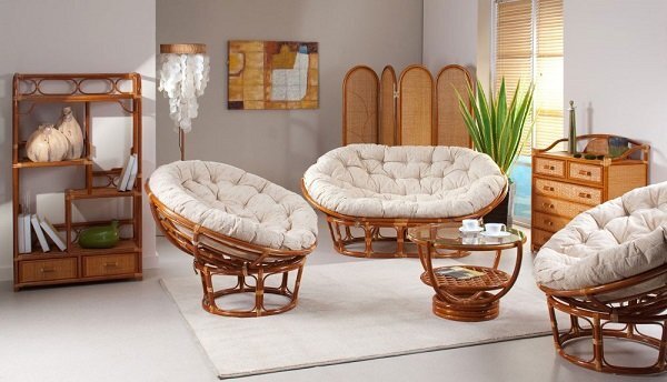 А лёгкость и мобильность, которой обладают плетеная мебель в интерьере и кресло Папасан, способствуют удобству перемещения мебели, которая пригодна для эксплуатации внутри помещения и на свежем воздухе.