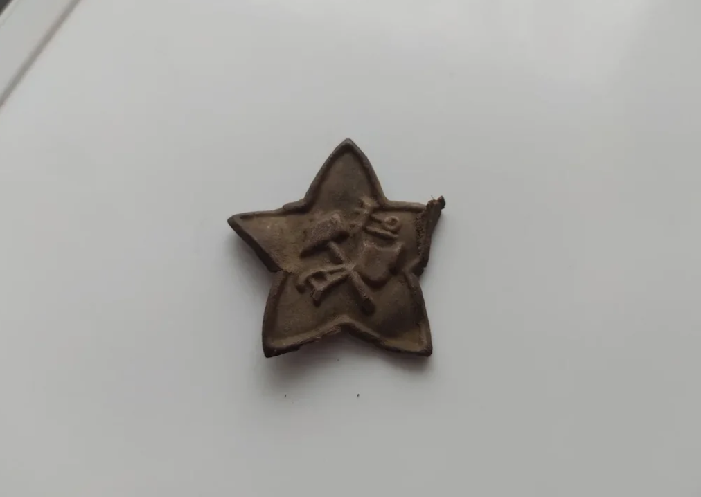 Звезда на фото выполнена из тонкого металла, а потому за долгие годы лежания в земле получила некоторые повреждения. Крепление осуществлялось с помощью "усиков" из такого же тонкого металла.