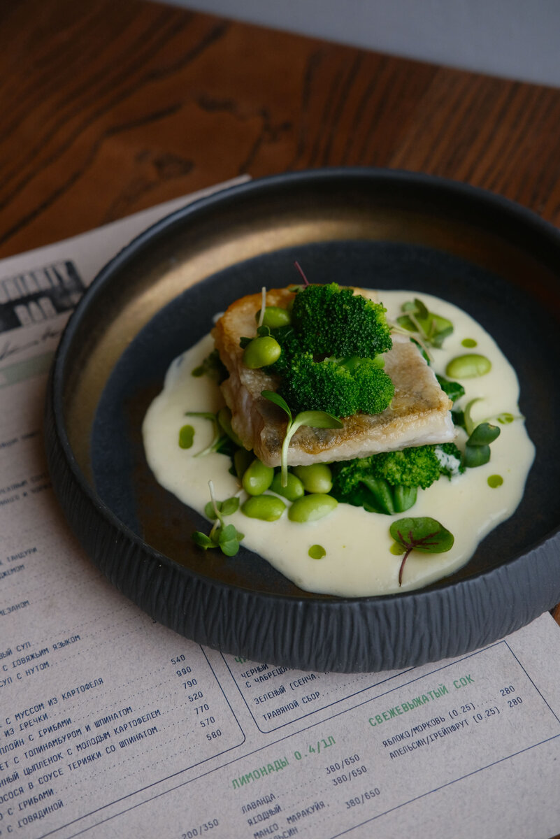 Сегодня будет рецепт трески с зелеными овощами и ванильным соусом.