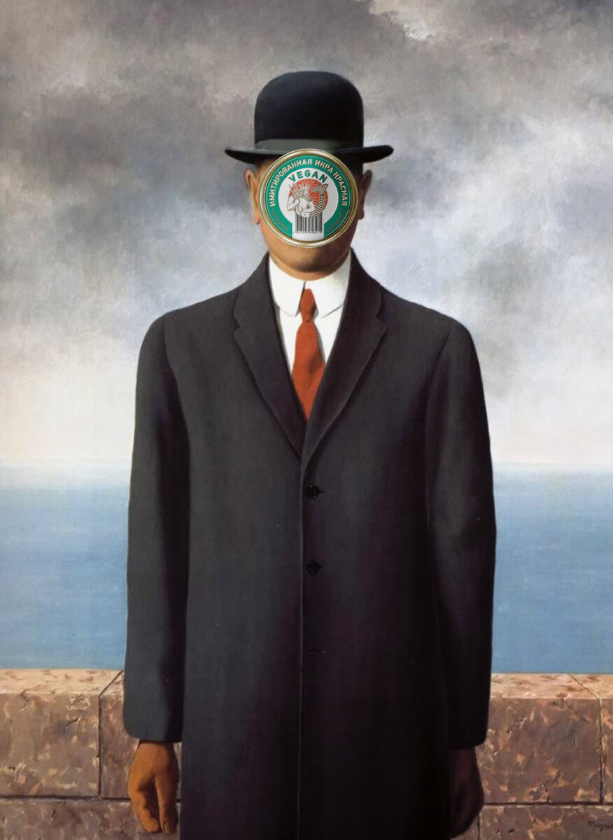 Художник писал эту картину как автопортрет. На оригинале лицо мужчины скрыто зеленым яблоком, а мы решили на его место "поставить" баночку икры Vegan.