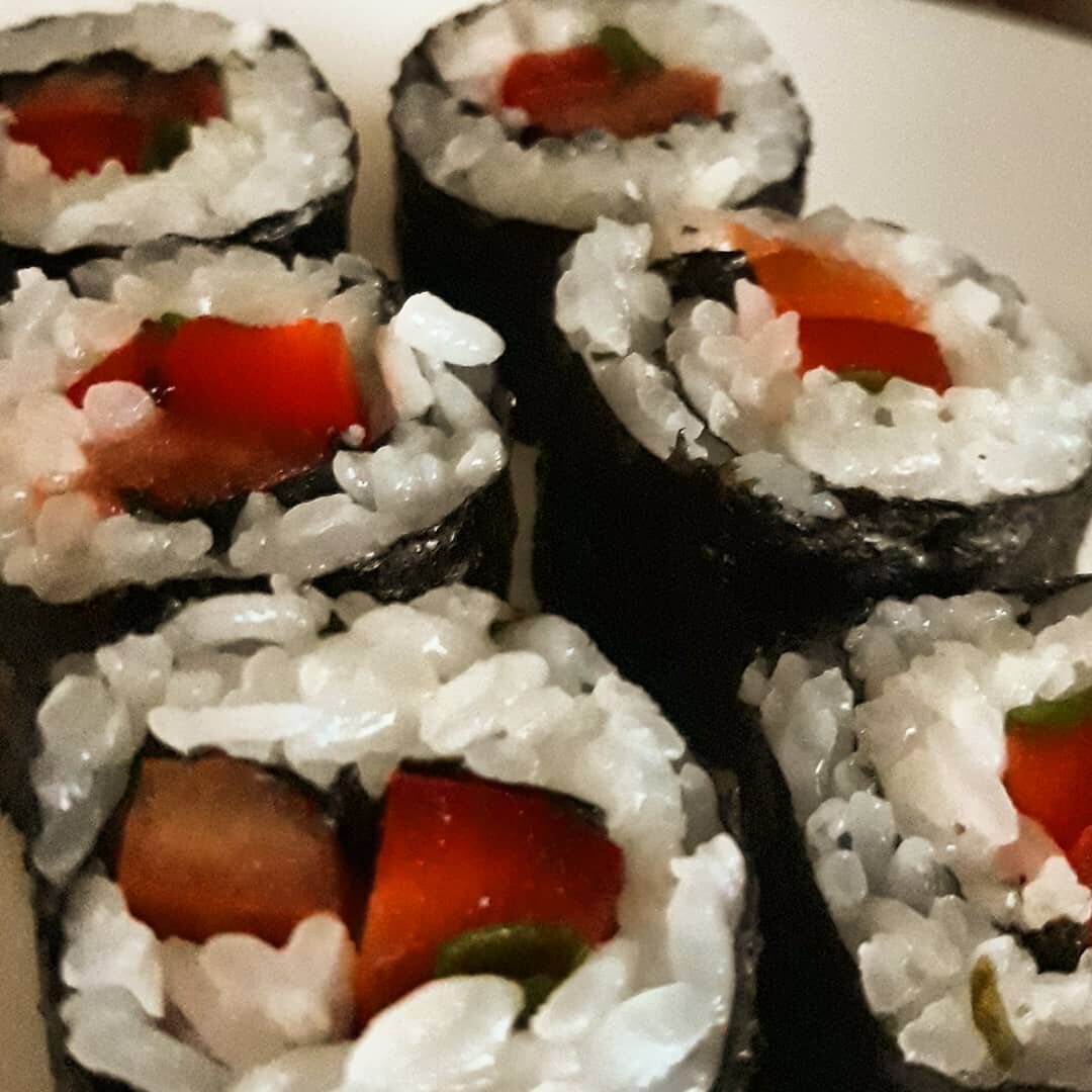 Когда очень хотите суши, но вы на диете или соблюдаете пост, сделайте овощные:) Побольше вкусных сочных овощей: перца, огурца, томата, авокадо, зеленого лука (лук вообще беспроигрышный ингридиент) и поменьше риса, добавьте немного кунжута😉 На моем фото риса многовато, я считаю, можно делать совсем тонкий слой, это только лучше👍 Овощные роллы могут и правда быть вкусными, если к их приготовлению