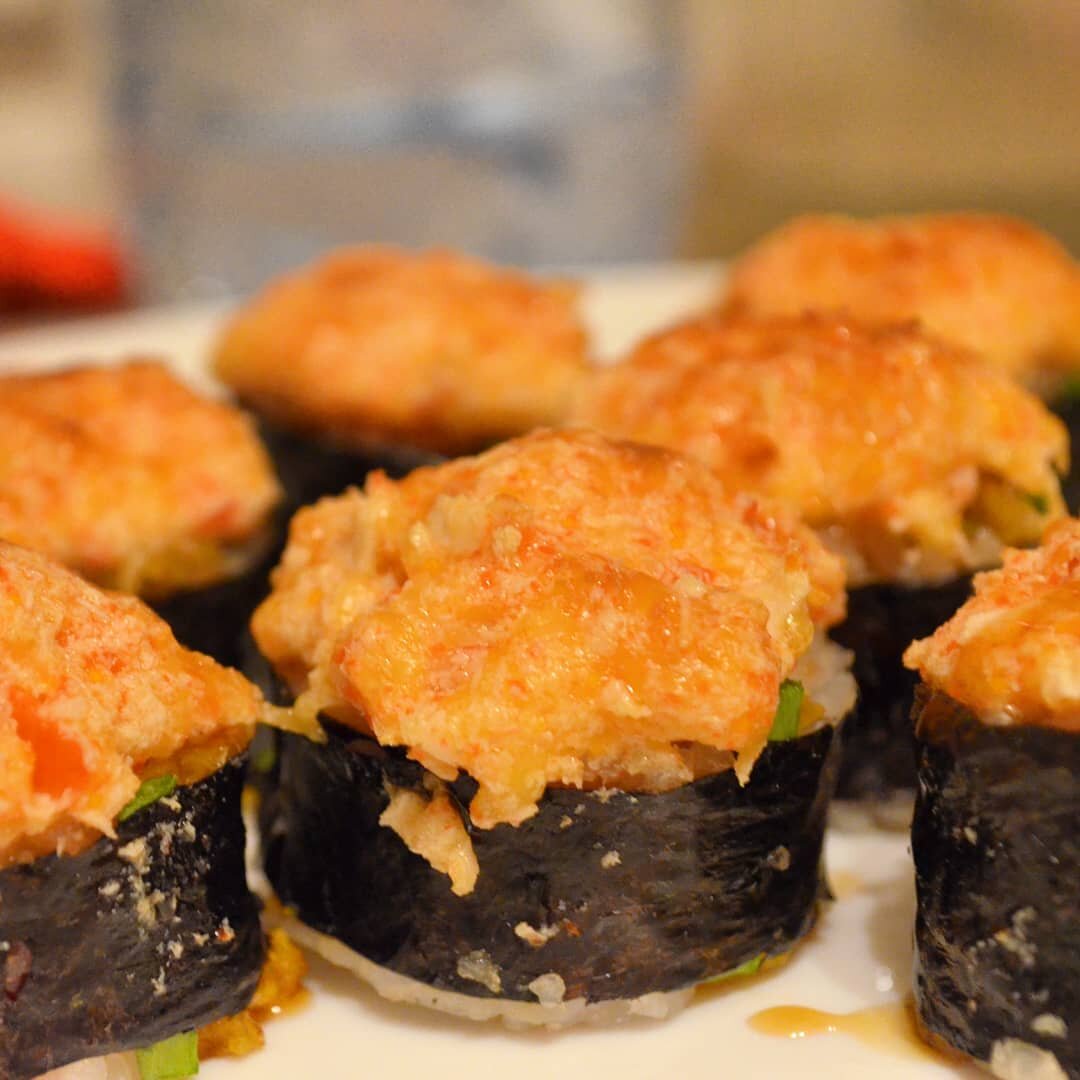 Привет, сушилюбы:)!✌Это мой "Краб-кейк", точнее запеченый ролл с крабовой палочкой или крабом, с нежной текстурой "шапки", но довольно острый. Можно сделать его совсем не острым, но это при условии использования натурального сочного краба, только его можно приобрести либо в Японии либо на острове Сахалине, в общем там где он обитает в естественных условиях, но привезти его домой еще то