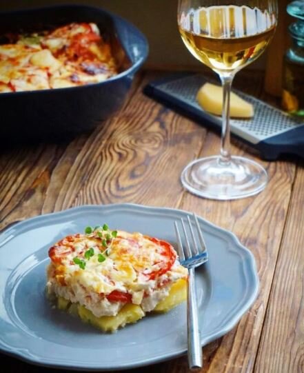 Посыпаем все тертым сыром (я посыпаю за 10 минут до готовности) и в выпекаем при температуре 200-220 С минут 40-45 до полной готовности.