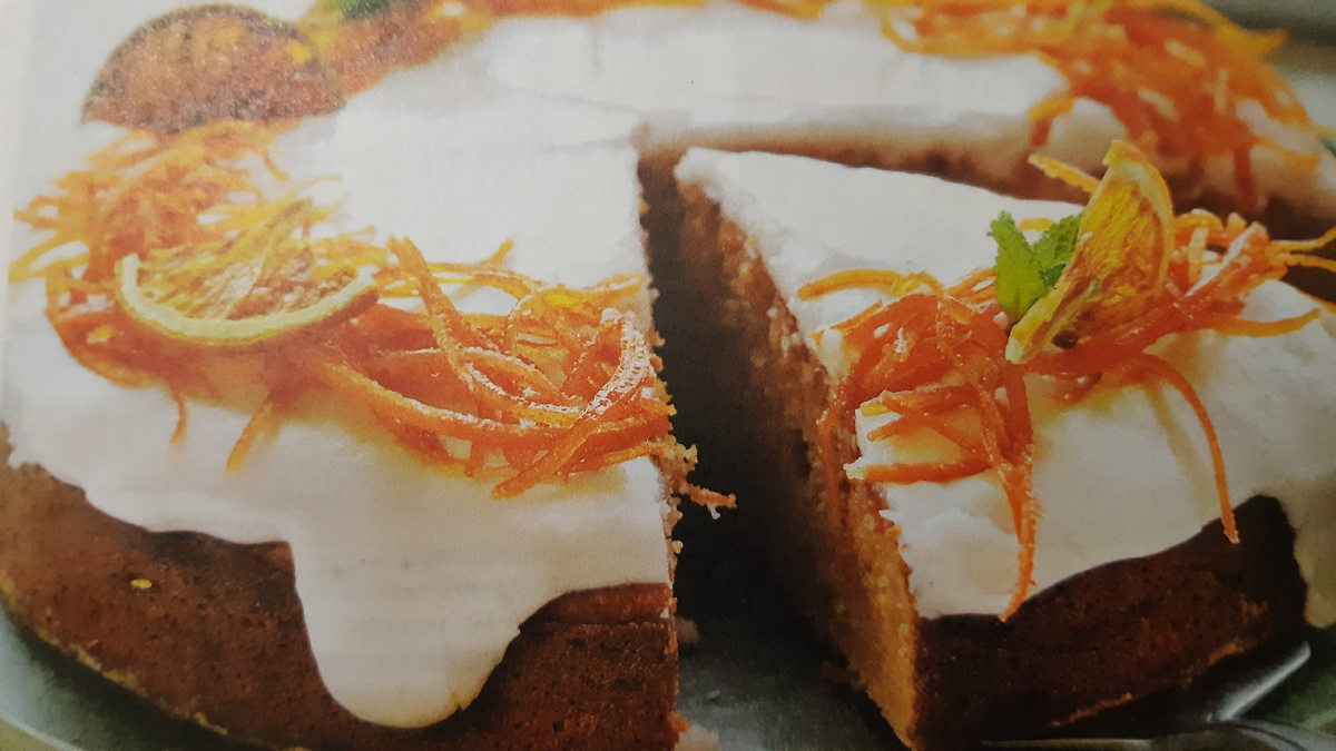 - Переложите бисквит на блюдо, полейте глазурью и украсьте карамелизированной цедрой , кружочками апельсинов и листочками мяты.