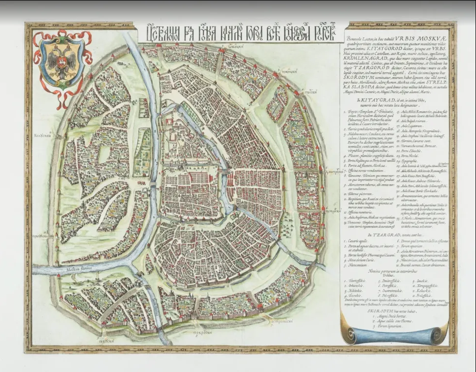 Несмотря на то, что карта была отпечатана в Голландии, её название выведено русской вязью и гласит: «Царствающои град Москва началнои город всех московских государствах».
