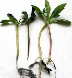 Стебельки пораженных ею растений утончаются и темнеют у корневой шейки. Корни отмирают,