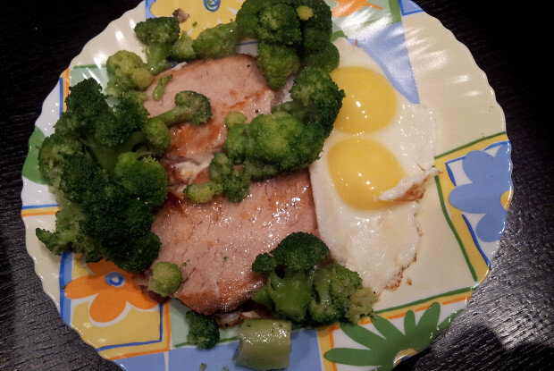 Подавать можно как в холодном, так и в теплом виде. В этом рецепте гарниром служит брокколи и яйцо — вариант для ужина.