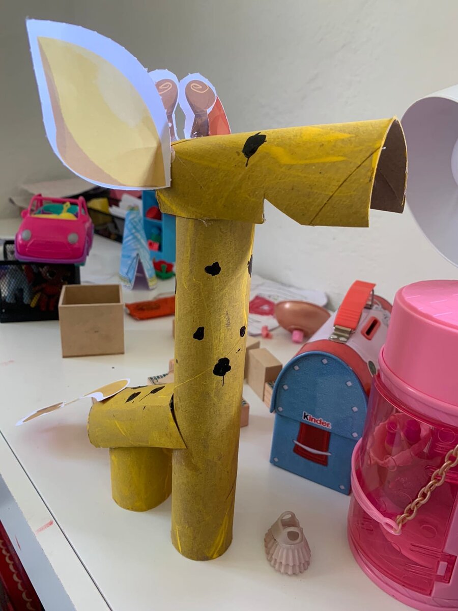 Соня перед онлайн-уроком музыки принесла своего жирафа из втулок, которого на днях смастерила в школе, поставила по правую руку от себя и сказала: