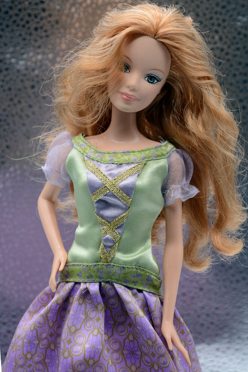 Расскажу чуть-чуть о Барби из серии "Карнавал". Моя вроде как принцесса на горошине. Купила ее за компанию — ехала за Барби Бутик 2002 года, чье тело потом отдала перепрошитой Рапунцель. Девушка продавала на «Юле» по 200₽ каждую куклу, я решила, что эта вполне красотка, хотя мечтала о другой принцессе на горошине. :D Да тогда вообще не знала, кто это. И сама найти не смогла, поэтому загрузила в соответствующий альбом в группе Identification Dolls, а знатоки меня сориентировали. По промо-фото я бы никогда не узнала в ней свою. Кстати, регулярно вижу просьбы кукольников помочь с опознанием этой Барби, так что я не одинока. :) К моей шло родное платье, но без аксессуаров и обуви. Что странно, одно такое платье у нас с сестрой уже было. Откуда взялось, неизвестно. В оригинальной комплектации с куклой кроме одежды были две короны (золотая и сиреневая), золотое ожерелье, сиреневые и золотые лодочки, две белые расчески, белое зеркальце и сиреневая карнавальная маска на палочке. Мне кажется, ч
