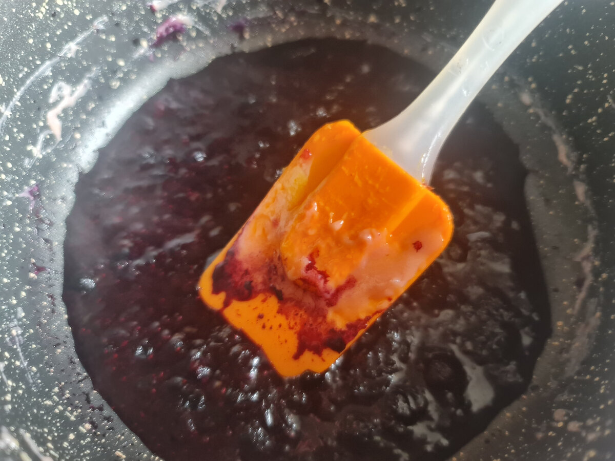 Отправляем в ковш с толстым дном 80 граммов черничного пюре и 10 граммов сахара, кипятим 4 минуты до небольшого загустения.