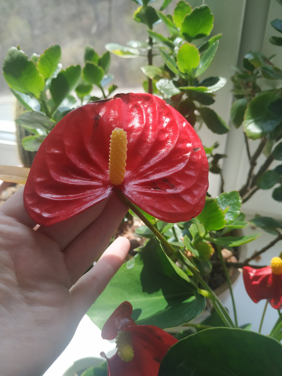 Особо красив антуриум во время цветения. Его мелкие цветки собраны в соцветие-початок, по форме напоминающее хвост. Отсюда и название растения, которое переводится как «хвостатый цветок».