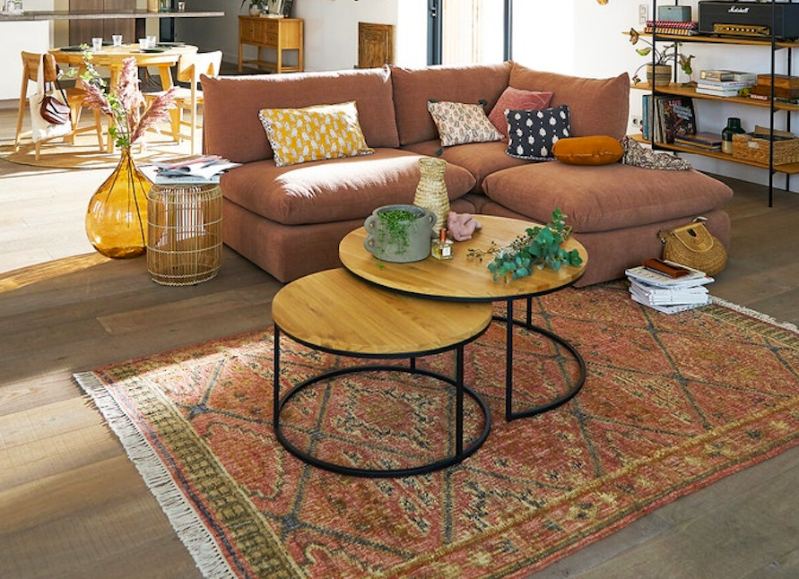 Чтобы яркий ковер стал цветовым акцентом французы повторяют его оттенок в декоре, например в подушках.