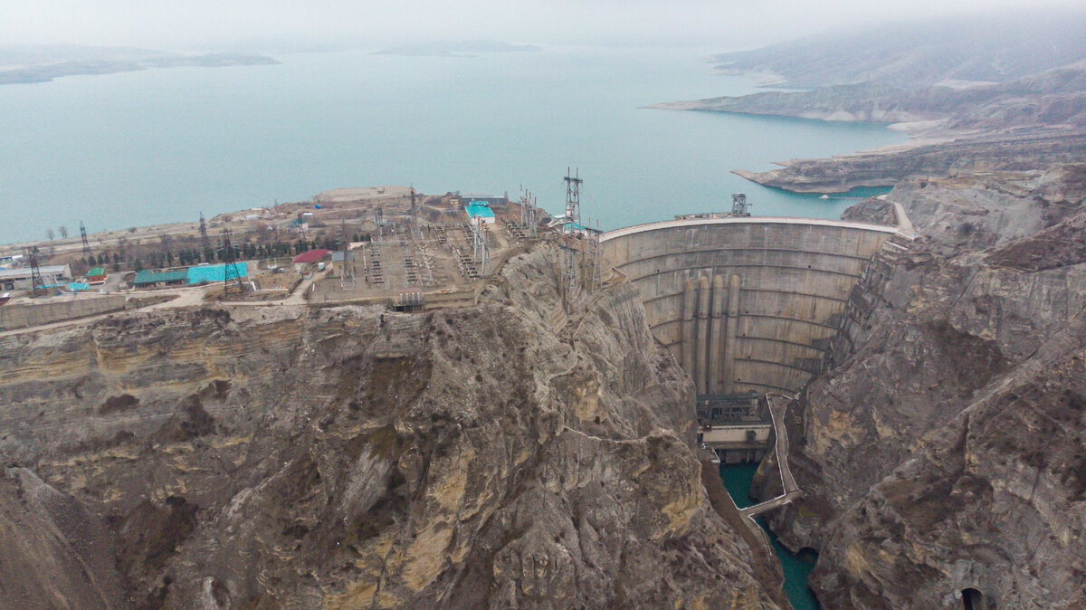 Вид Кавказских гор сам по себе впечатляет и внушает уважение. Но когда ты видишь огромную бетонную стену, которая полностью перекрывает огромный каньон, впечатления усиливаются в стократ. Тело плотины соединило собой два края Сулакского каньона, перекрыв реку Сулак. Проект ГЭС был утвержден в 1962 году, и с 63 года начались работы. Перед строителями стояла сложнейшая задача, начиная с подготовительного этапа, прокладки дорог, подводки электролиний, основание площадки под строительство, возведение поселка гидростроителей (Дубки). Проходка тоннелей для ГЭС началась в конце 1965 года. В 67 году русло реки Сулак было перекрыто с помощью направленного взрыва, после чего строители получили возможность приступить к разработке котлована. Само же тело плотины начали заливать бетоном лишь в феврале 70 года. И даже невзирая на крупное землетрясение, 22 декабря 1974 года на Чиркейской ГЭС был запушен первый гидроагрегат. Мощная арочная плотина получилась 338 метров в длину по гребню, и 232метра