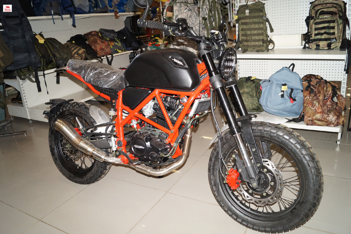 На днях был в магазине, где продается спортивный и туристический инвентарь. И знаете что? Увидел в продаже новенький мотоцикл Minsk SCR 250. Пройти мимо не смог. "Минск" с брутальной внешностью, привлёк моё внимание. Это уже не тот "хлюпик", что выпускался при СССР, а кардинально другой мот. Расспросив продавца, узнал следующее: Мотоциклы Minsk SCR 250 собирают на Минском мотоциклетно-велосипедном заводе. Minsk SCR 250 (Scrambler) - мотоцикл двойного направления: его стихия не только асфальтированные городские дороги, но и "пересеченная местность", то есть легкое бездорожье просёлочных дорог. Передняя фара, задний фонарь и поворотники - вся оптика светодиодная. Бортовое напряжение электросети - 12 Вольт. В мотоцикле Minsk SCR 250 пластиковые комплектующие использованы по минимуму, он практически весь сделан из металла. Что внушает доверие. Хотя качество покраски не на высоте. Сухой вес мотоцикла - 135 кг. Двигатель от компании "LONCIN": одноцилиндровый, карбюраторный, четырёхтактный,