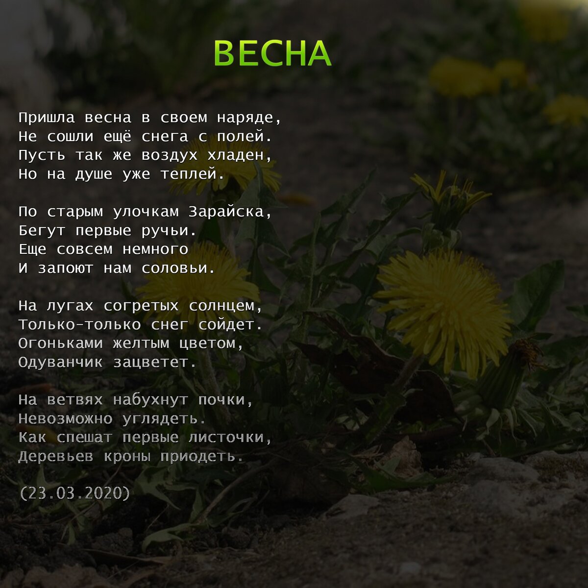 Пришла весна в своем наряде,Не сошли ещё снега с полей.Пусть так же воздух хладен,Но на душе уже теплей.По старым улочкам Зарайска,Бегут первые ручьи.Еще совсем немного,Как запоют нам соловьи.На лугах согретых солнцем,Только-только снег сойдет.Огоньками желтым цветом,Одуванчик зацветет.На ветвях набухнут почки,Невозможно углядеть.Как спешат первые листочки,Деревьев кроны приодеть. (23.03.2020)