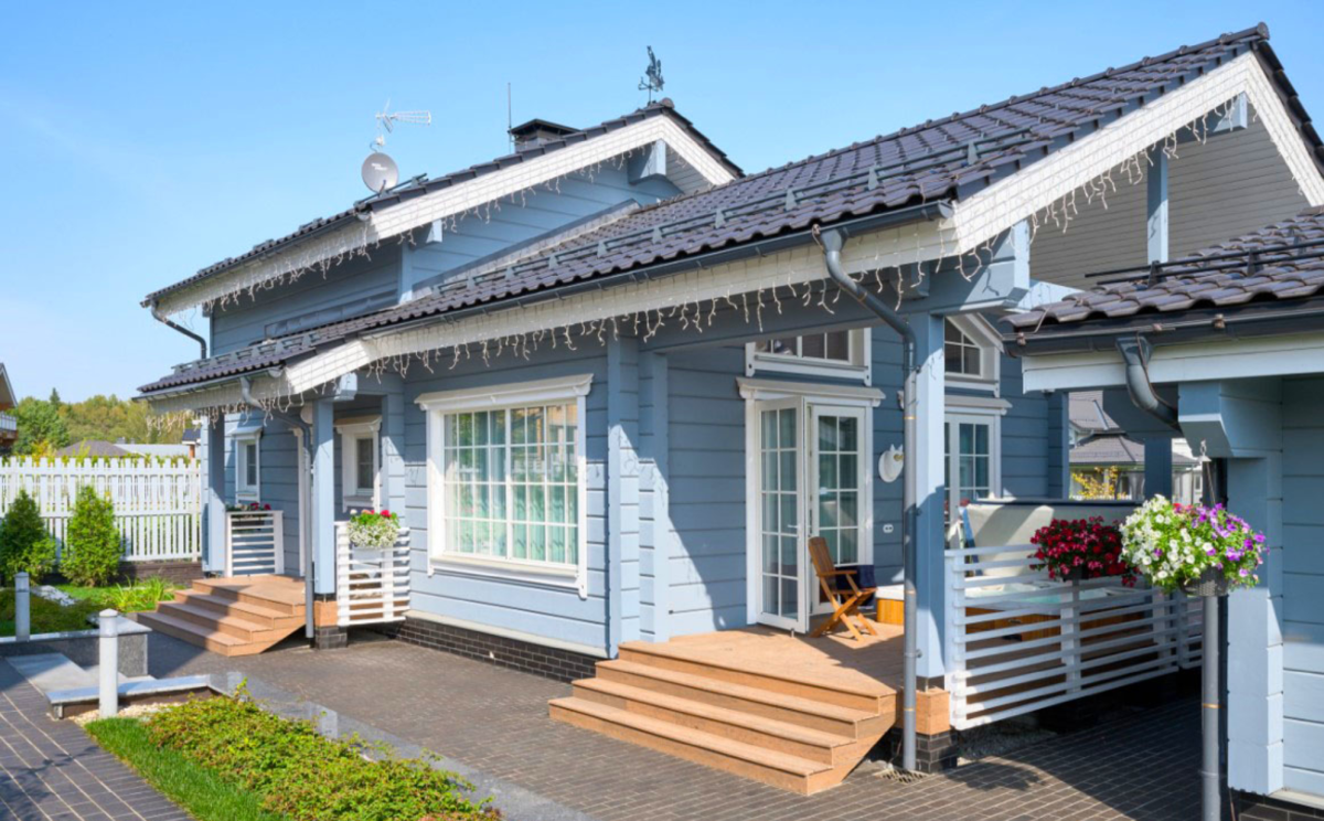 Красивый, почти сказочного вида дом с голубым фасадом и разноуровневой двускатной кровлей возведен из клееного бруса по фирменной технологии компании.
