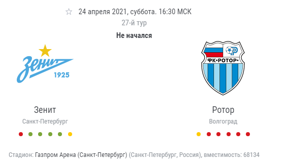 Зенит провалил матч в Краснодаре начав играть только при счете 2-0, игру удалось свести к ничьей и надеюсь Семак сделает правильные выводы. Ротор после долгих лет вернулся в премьер-лигу, но похоже не надолго, команда проигрывает матч за матчем и находится в зоне вылета. Зениту нужно набрать 6 очков для чемпионства и данный домашний матч это отличная