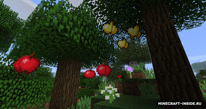 С этим модом яблоки будут расти на деревьях. Есть 2 вида - яблони с обычными яблоками и с золотыми.