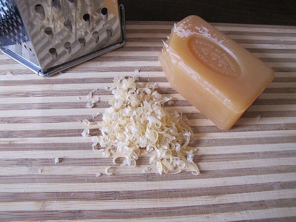 Мыло лучше натирать на мелкой терке — так лучше растворяется, и на одежде не останется белых следов от крупных кусочков)