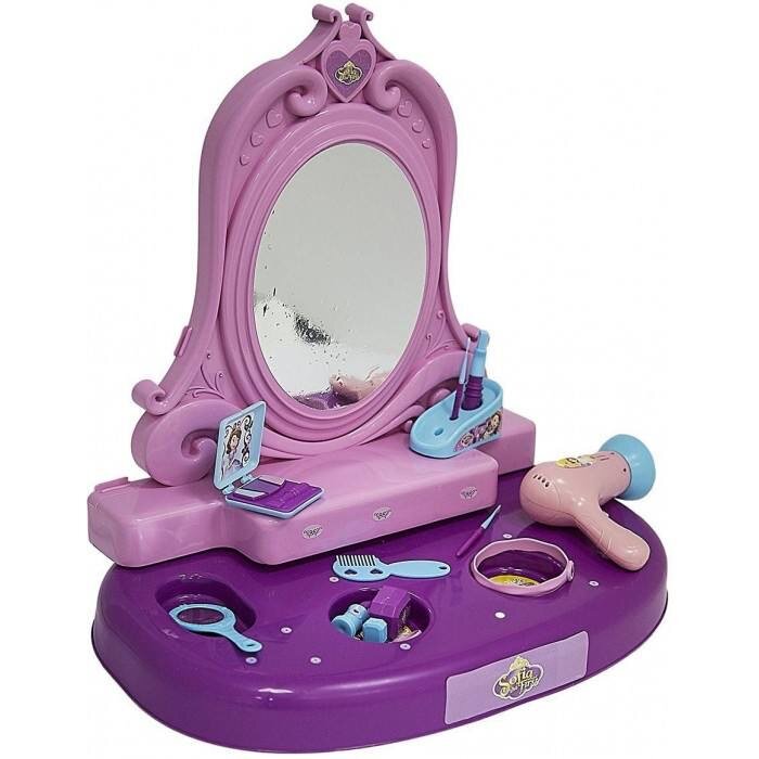 👑 Игровая парикмахерская «Принцесса София» представлена необходимыми предметами для увлекательной игры в парикмахерскую: столик с большим зеркалом, расчёски разных видов, фен для укладки, различные украшения и другие аксессуары, позволяющие сделать игру более разнообразной и захватывающей.