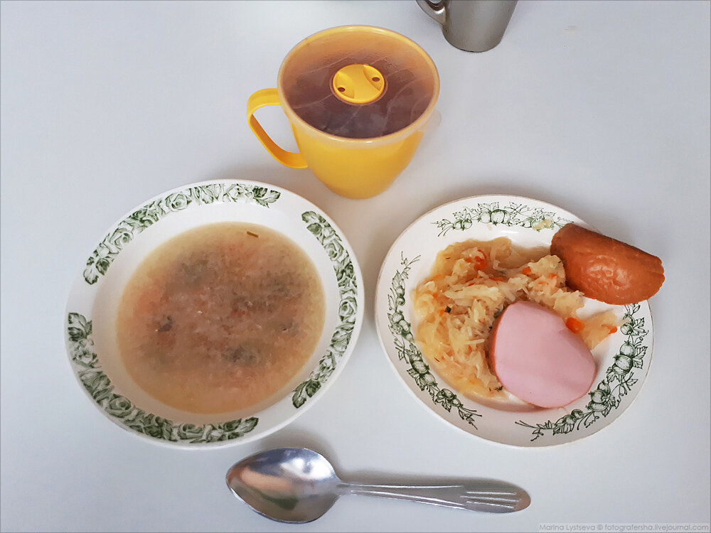 Суп из говядины,квашенная капуста с колбасой и чай .
