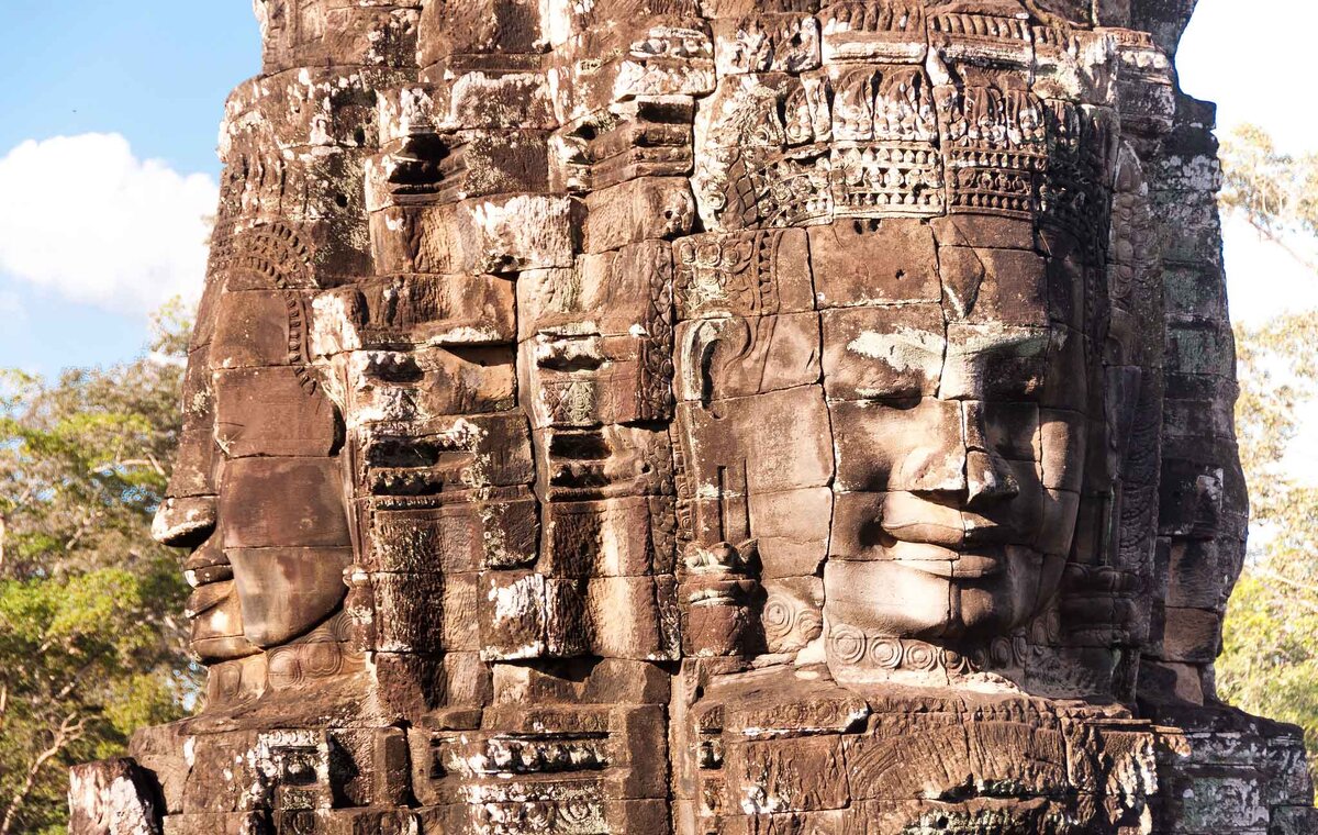 Храм Байон возведен в середине семнадцатого века в центре древней столицы Камбоджи – в городе Ангкор-Тхом. Оккультное сооружение возвели по приказу короля Джаявармана VII. По тем временам храм имел гигантские размеры, он состоял из трех ярусов, к тому же его последовательно окружали три фортификационные стены, так как времена были весьма неспокойные. Джаявармана VII был удачливым полководцем, его битвы завершались победами, казна пополнялась. Столицу государства, Ангкор-Тхом защищало особое каменное кольцо. Больше интересных статей о приметах и традициях разных народов мира вы можете прочесть на нашем сайте Суеверия Эксклюзивная архитектура древних зодчих Байон сооружен в духе буддизма, однако в его облике можно увидеть явные черты индуизма. Основным украшением храма являются башни, на них высечены каменные лики. На каждой башне было четыре лика. Зодчие расположили их таким образом, что они смотрят в разные стороны света. Еще один любопытный факт — в зависимости от положения солнца лик