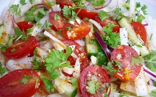 По-русски, салат с помидорками и огурчиками, но такого вкусного салата, может вы и не пробовали ?)) Сейчас расскажу