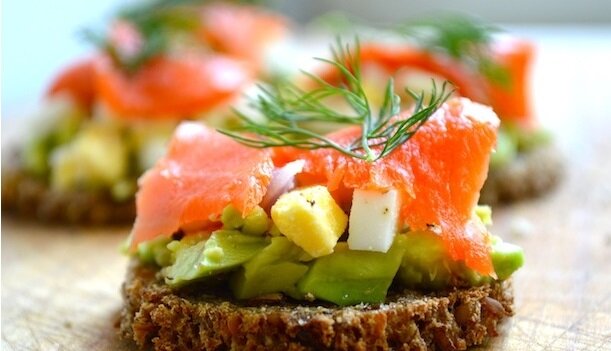 Как хлеб подсох,остужаю его и выкладываю вареные яйца, нарезанный авокадо,лук и немного горчицы. Также выкладываю семгу.