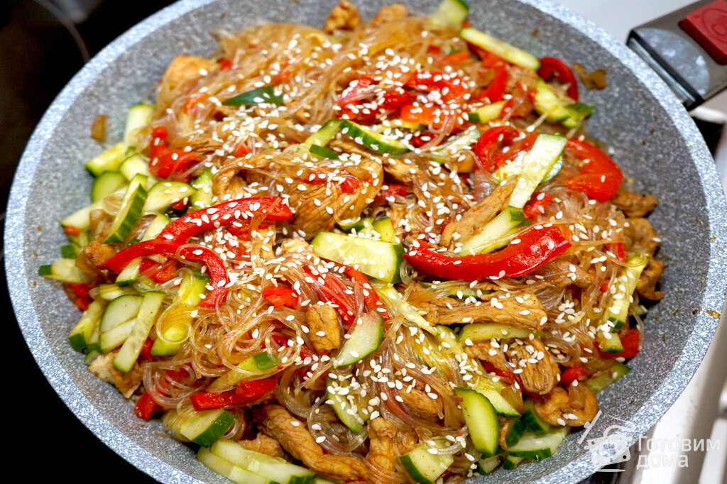 Это оригинальное блюдо украсит не только семейный ужин, но и праздничный стол, к тому же готовится в течение получаса. Обжариваем на сковороде куриное мясо, болгарский перец, огурец, морковь, лук двух видов. Затем добавляем распаренную фунчозу и прогреваем всё вместе. Результат получается превосходный: нейтральная фунчоза впитает все ароматы куриного мяса и овощей.