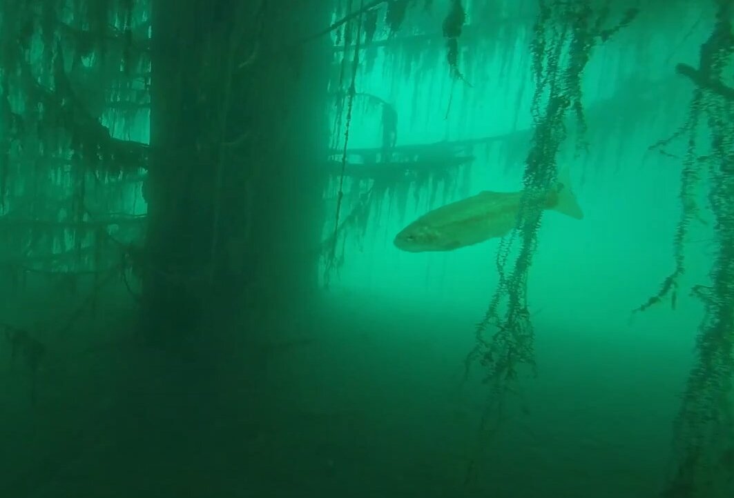 Это необычное место с подводным хвойным лесом и рыбками между деревьями находится в Казахстане.