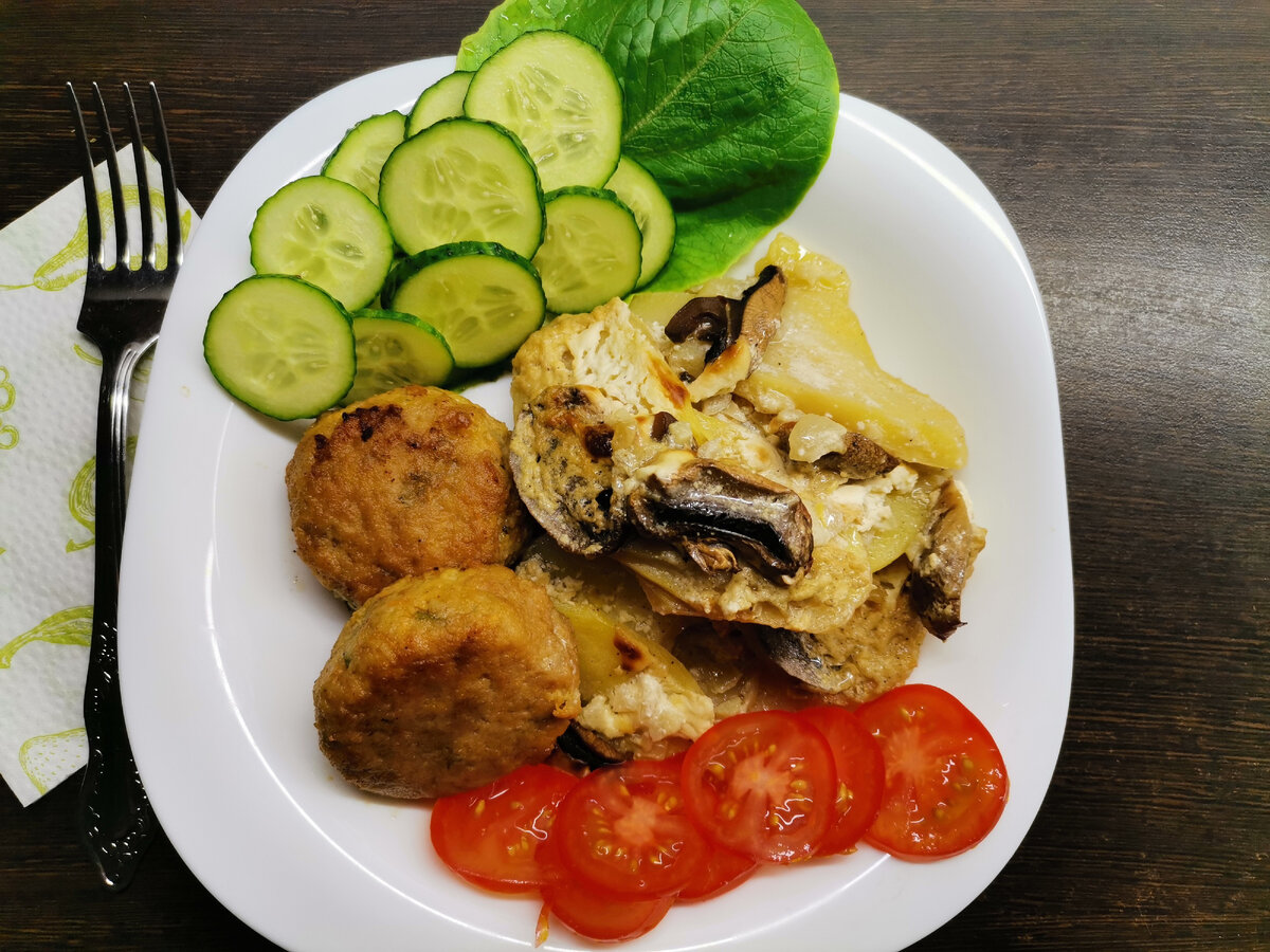 Вынимаем картошечку из духовку и выкладываем на тарелку с "рыжиками", салатом и овощами