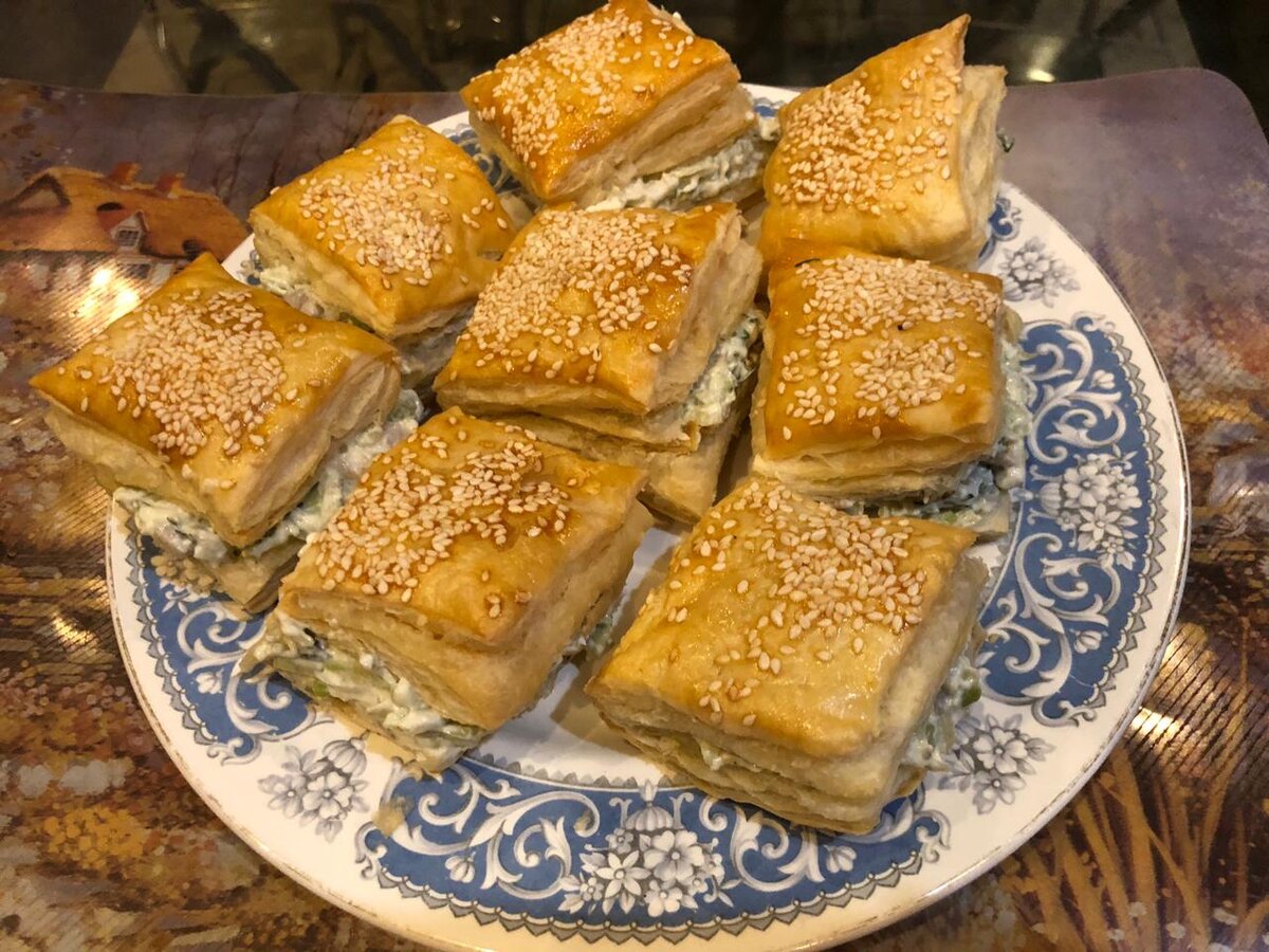 1. Разморозить слоеное тесто и нарезать пластинку теста на 8 квадратиков.