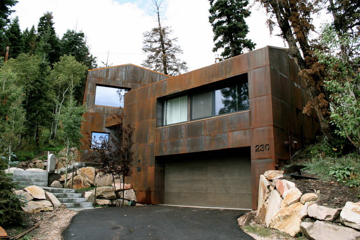 Этот современный энергоэффективный дом построен внизу живописного лесистого склона.