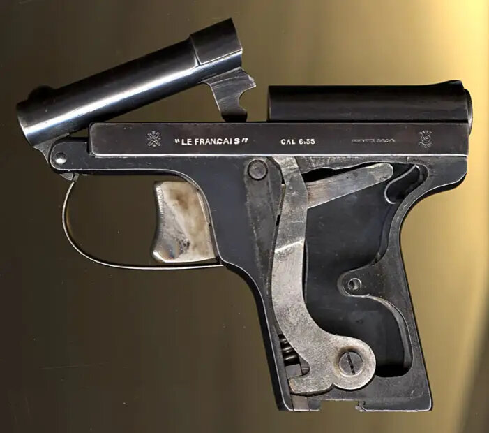 Итак, к 1912 году, когда начал создаваться этот пистолет авторства Этьена Мимара, "жилетники" можно было разделить условно на две группы - прямо основанные на идеях Джона Браунинга и, напротив, старательно пытающиеся быть "не такими". И не только из-за патентных прав - каждому ведь хочется создать что-то свое, не так ли? Le Francais задача "быть не Браунингом" удалась однозначно. Достаточно взглянуть на него в разрезе и вдуматься в принцип функционирования его механизма: