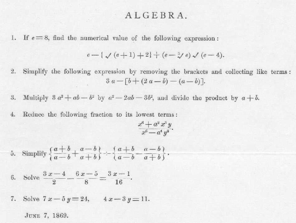 Мне на глаза попались вступительные задания в один из престижнейших ВУЗов мира — Массачусетский институт (MIT). Этот институт дал миру 93 нобелевских лауреата. Прелесть в том, что это вступительные задания образца 1869 года, то есть задания полуторавековой давности. Можно посмотреть, как сильно за эти годы образование шагнуло вперед. Фактически все задания под силу ученикам 7-8 классов нынешней общеобразовательной школы.