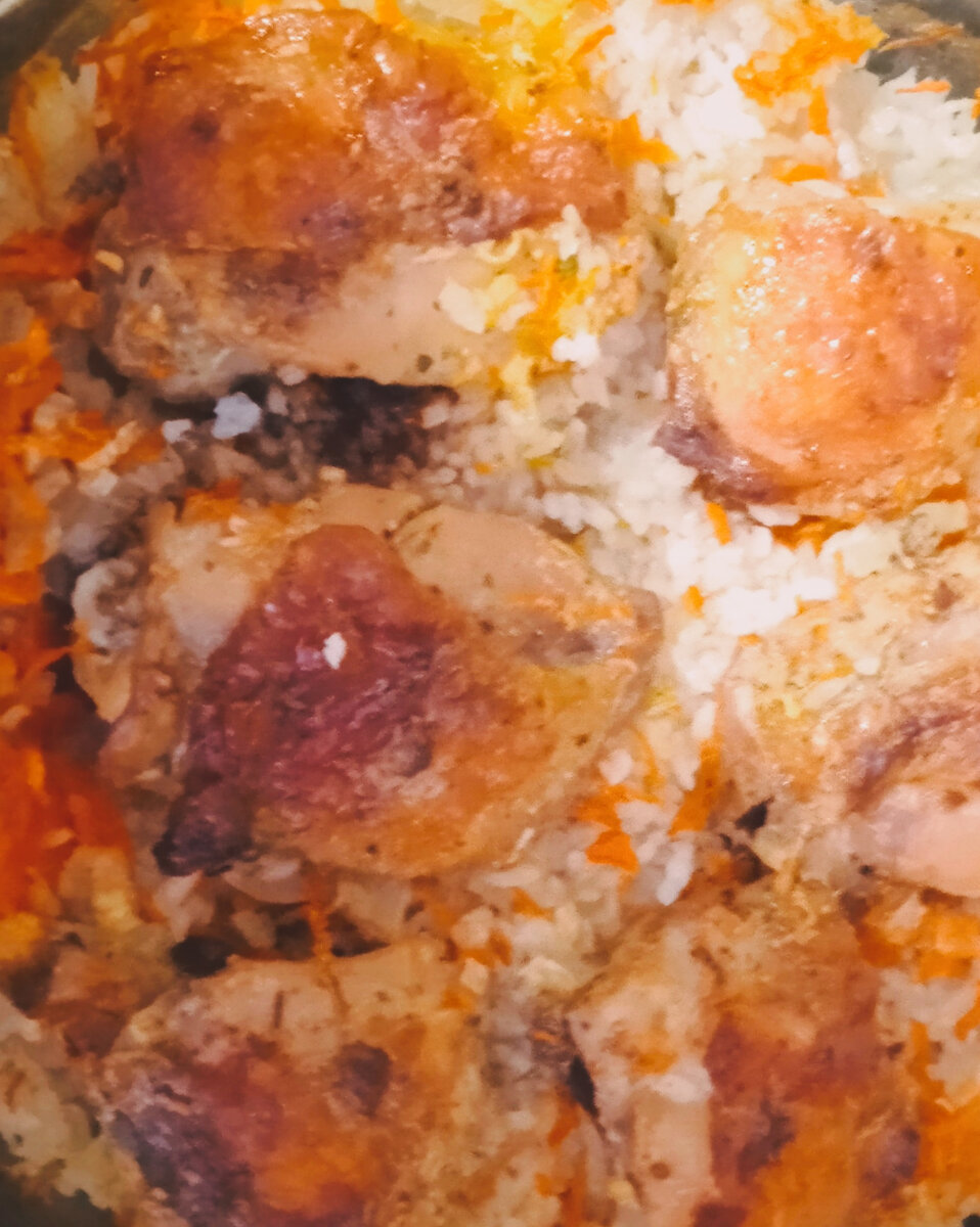 Предлагаю вам вкусный и сытный рис с курочкой в духовке. Это блюдо 2 в 1, готовится всë вместе, не нужно по отдельности сначала готовить одно, потом другое. А ещё чем мне этот рецепт нравится, тем что готовить очень просто и быстро, просто всë смешал и в духовку и пока запекается в духовке, занимаешься своими остальными делами, это ли не чудо? Продукты самые простые и бюджетные, а получается просто восхитительно вкусное блюдо, рис пропитывается всеми соками курочки, из-за этого получается не сухим, курочка получается нежной и сочной, прям тает во рту. Ингредиенты: Курица любая часть, но лучше окорочка или бëдрышки-600 гр. Морковь-1 шт. Лук репчатый-1 шт. Рис любой-1 стакан. Чеснок-2 дольки. Масло подсолнечное-1 ст. л. Сметана-3 ст. л. Соль-по вкусу. Приправа для курицы- по вкусу. Чёрный молотый перец по вкусу. Приготовление: Шаг 1: Курицу моем, разрезаем на порционные кусочки, я каждый бëдрышек разрезала пополам. Курицу солим, перчим, смазываем специями. В курицу добавляем