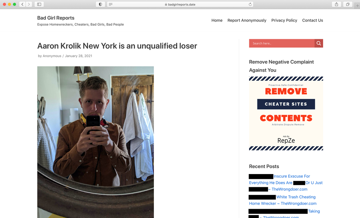 Когда я обратился к RepZe через форму на его сайте, чтобы спросить об удалении одного из сообщений обо мне, София позвонила мне. Она сказала, что за 1500 долларов сообщение будет удалено в течение 24 часов. По ее словам, удаление будет сопровождаться «пожизненной гарантией».