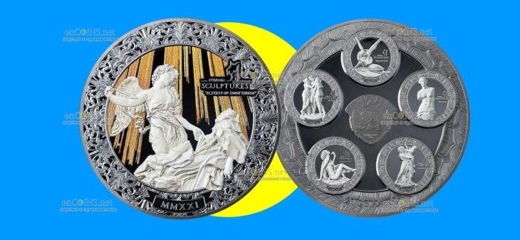 Данная монета выйдет в серии "Вечные скульптуры" и фактически является копией скуп туры Джованни Лоренцо Бернини "Экстаз Святой