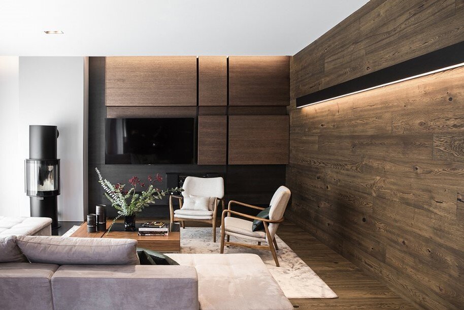 Этот интерьер рассчитан на семью из четырех человек. В архитектуре и отделке дома преобладает дерево, а окружающая среда естественна, поэтому в интерьере были выбраны глубокие землистые тона, вариации оттенков ореха и дуба, а также уютные текстуры. Проникающие оттенки дикой природы придают интерьеру особую атмосферу, которую хотели подчеркнуть. Подобранные гармонии тканей придают интерьеру особую