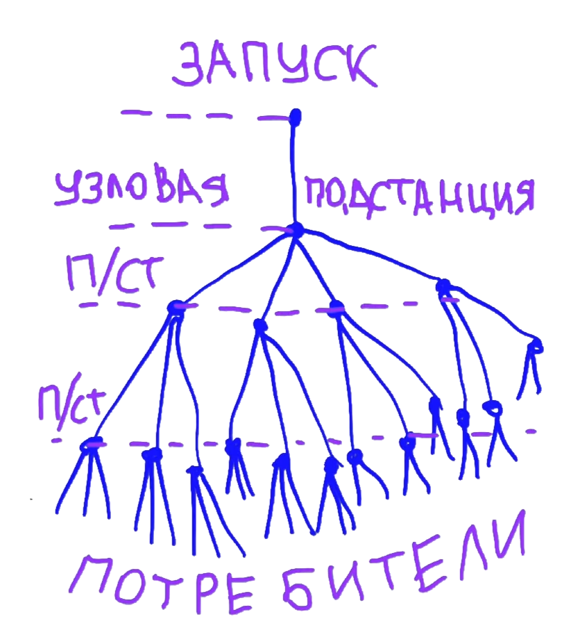 Как это происходит? Управляющий сигнал поступает с какой-то крупной подстанции, расходится на более мелкие, потом еще на более мелкие - это все напоминает веер