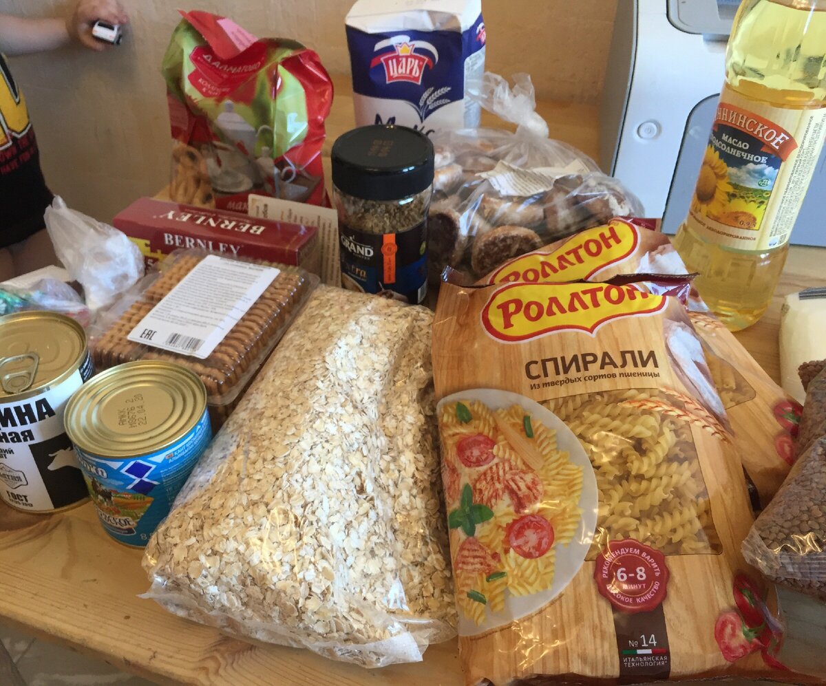 Продуктовый набор объемный, посылка весит 5-7 кг. Включает: крупы, макароны, тушенку, сушки и конфеты,