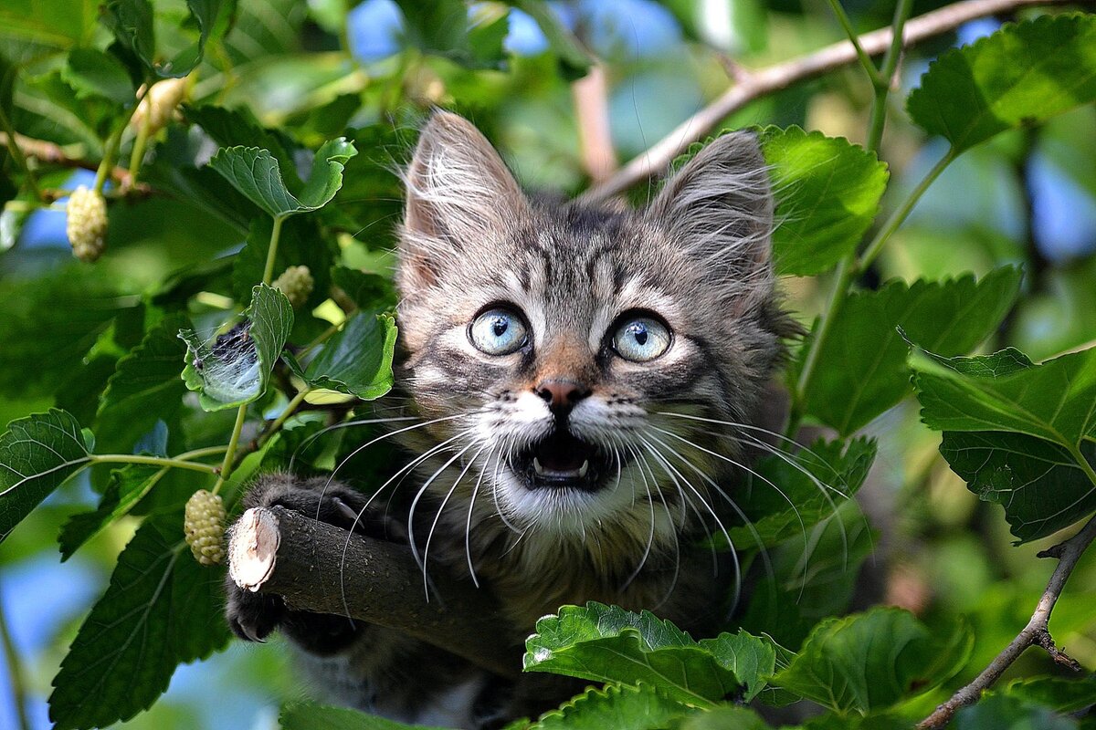 А бабочка покружила немного, и, как назло, подлетела именно к мирно застывшему на дереве котенку, и не нашла ничего лучше, как усесться прям ему на голову, и стала медленно шевелить крыльями.