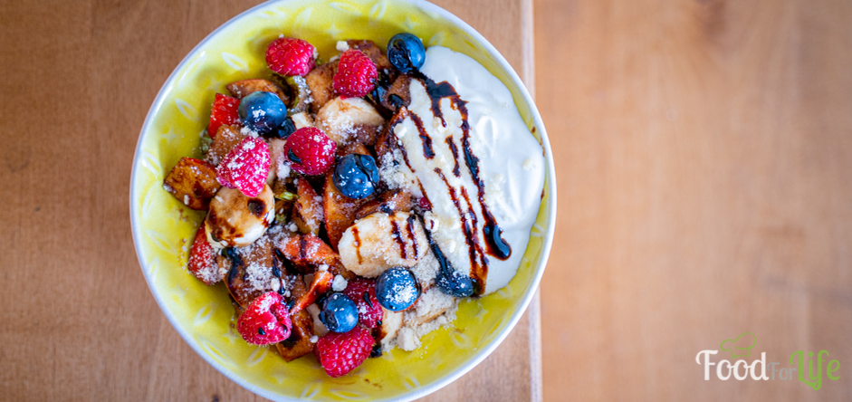 - Теперь перекладываем всё содержимое пиалы на тарелку, в которой планируется подача. Сверху посыпаем ягодами черники и малины, а также миндальной мукой или стружкой. Сбоку выкладываем сметану и немного поливаем бальзамическим соусом в качестве декора.