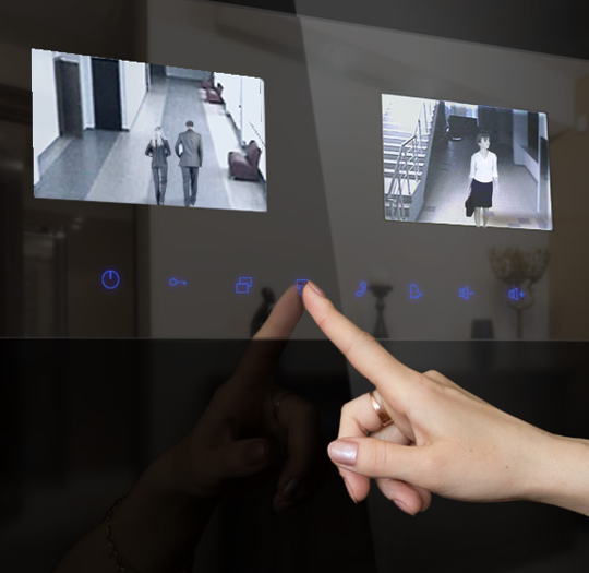 Защитный экран выглядит как угольно-черный глянцевый зеркальный экран. Не имеет аналогов на рынке. Находится в одной плоскости с декоративной панелью внутренней стороны. Защищает мониторы от механического повреждения. Преображает не только внешний вид двери, но и всей прихожей.